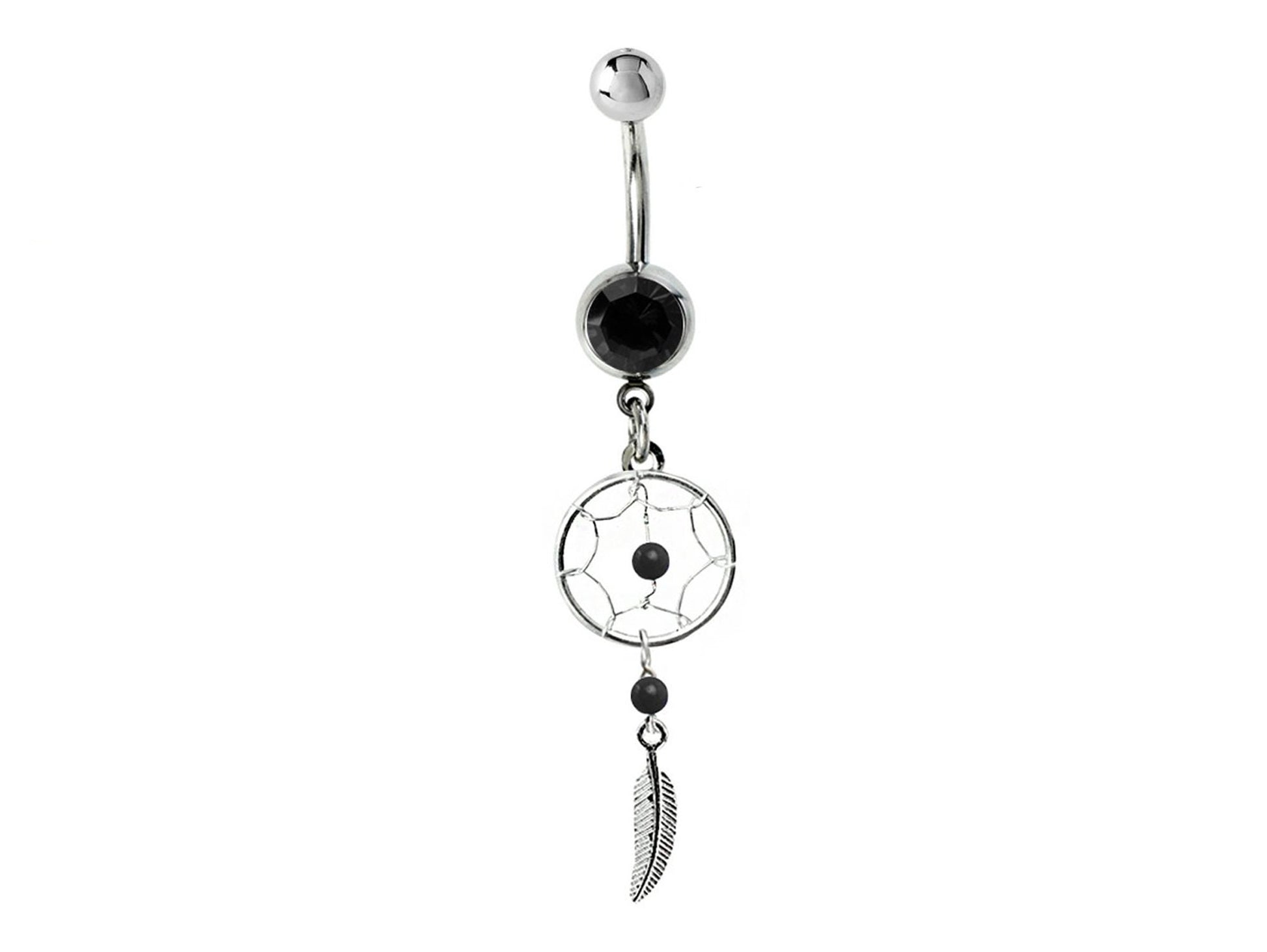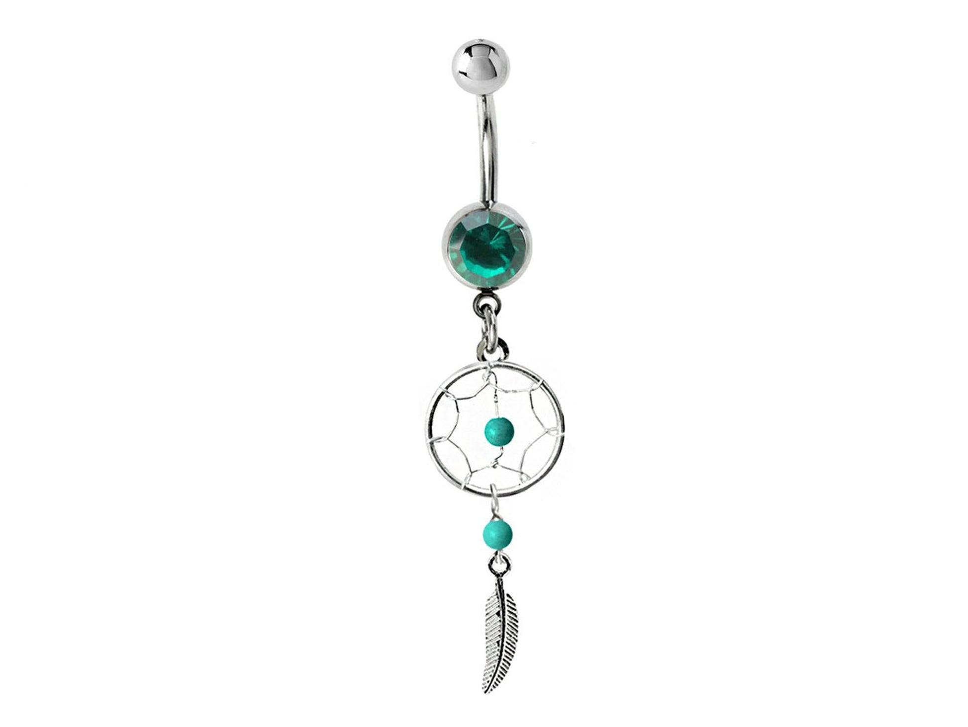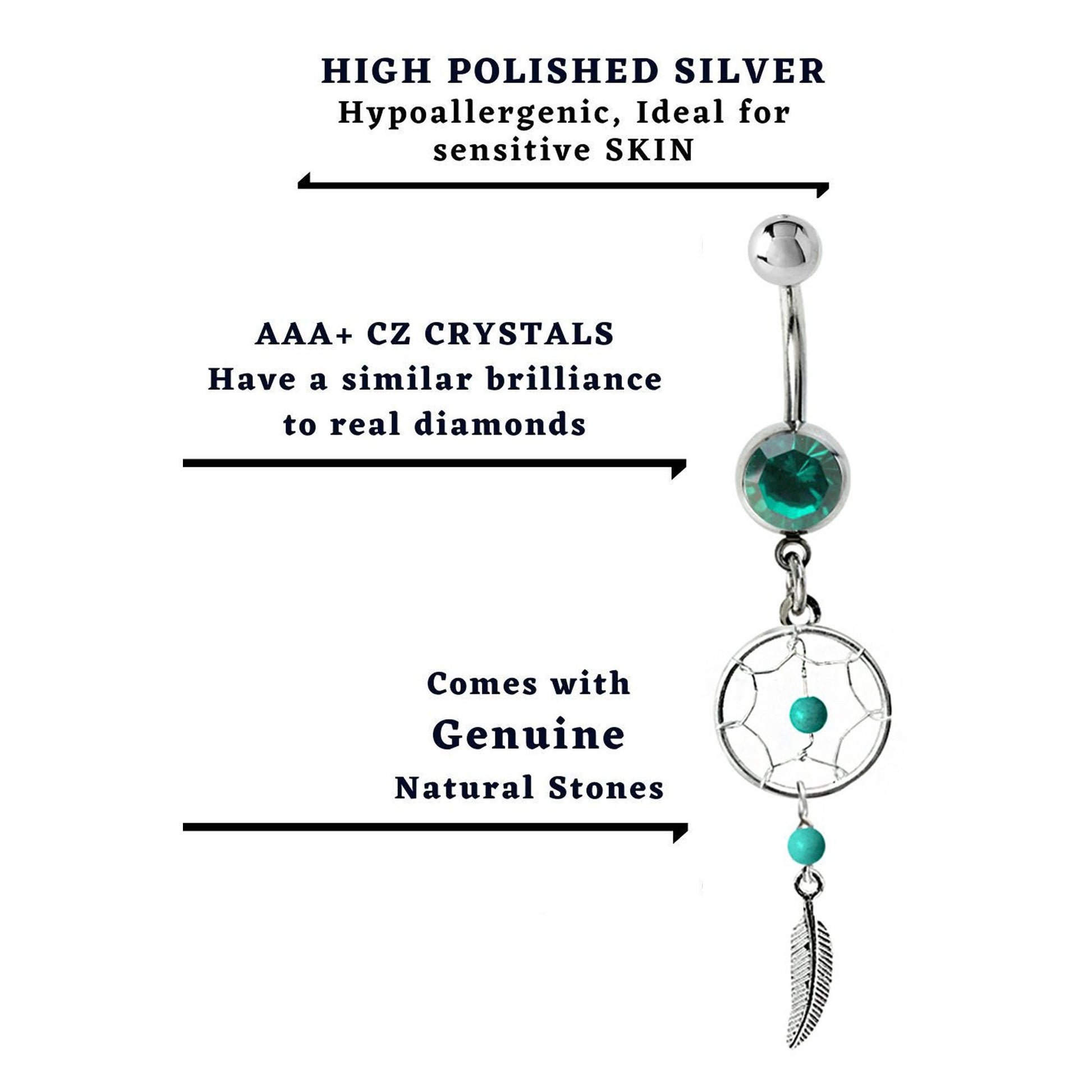 Belly Button Piercing, Navel Ring - Silver Dreamcatcher Jewellery Dangle Belly Bar with Crystal and Genuine Stone Beads- 14g (1.6mm)