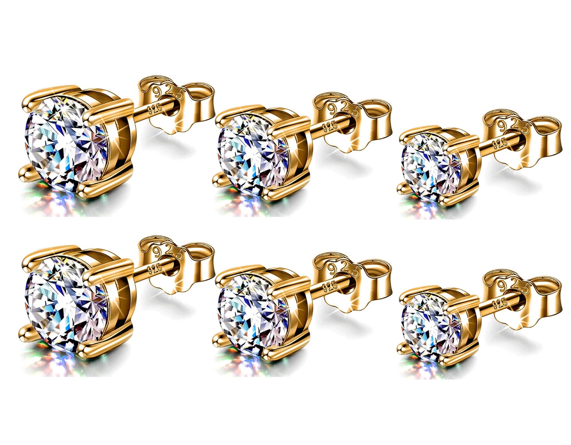 Gold Earrings for Women -18K Gold Plated Silver Solitaire Round Stud Earrings - Highest Quality Crystals Hand Set - Size 2mm to 7mm