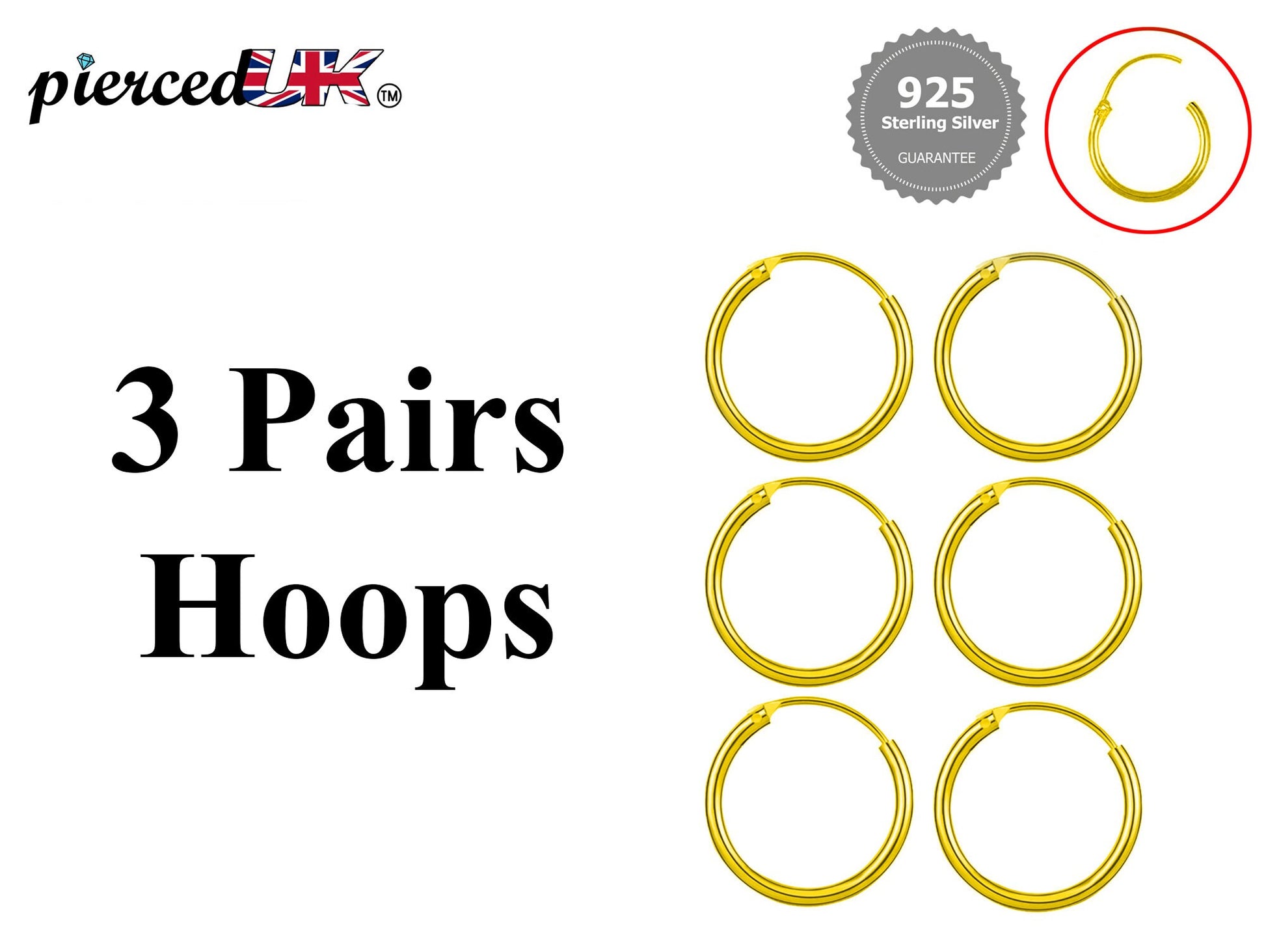 Hoop Earrings Silver- Set of 3 Pairs Small Hoops for Cartilage, tragus, conch, daith - 8mm to 60mm - Available in Gold and Rose Gold Plating