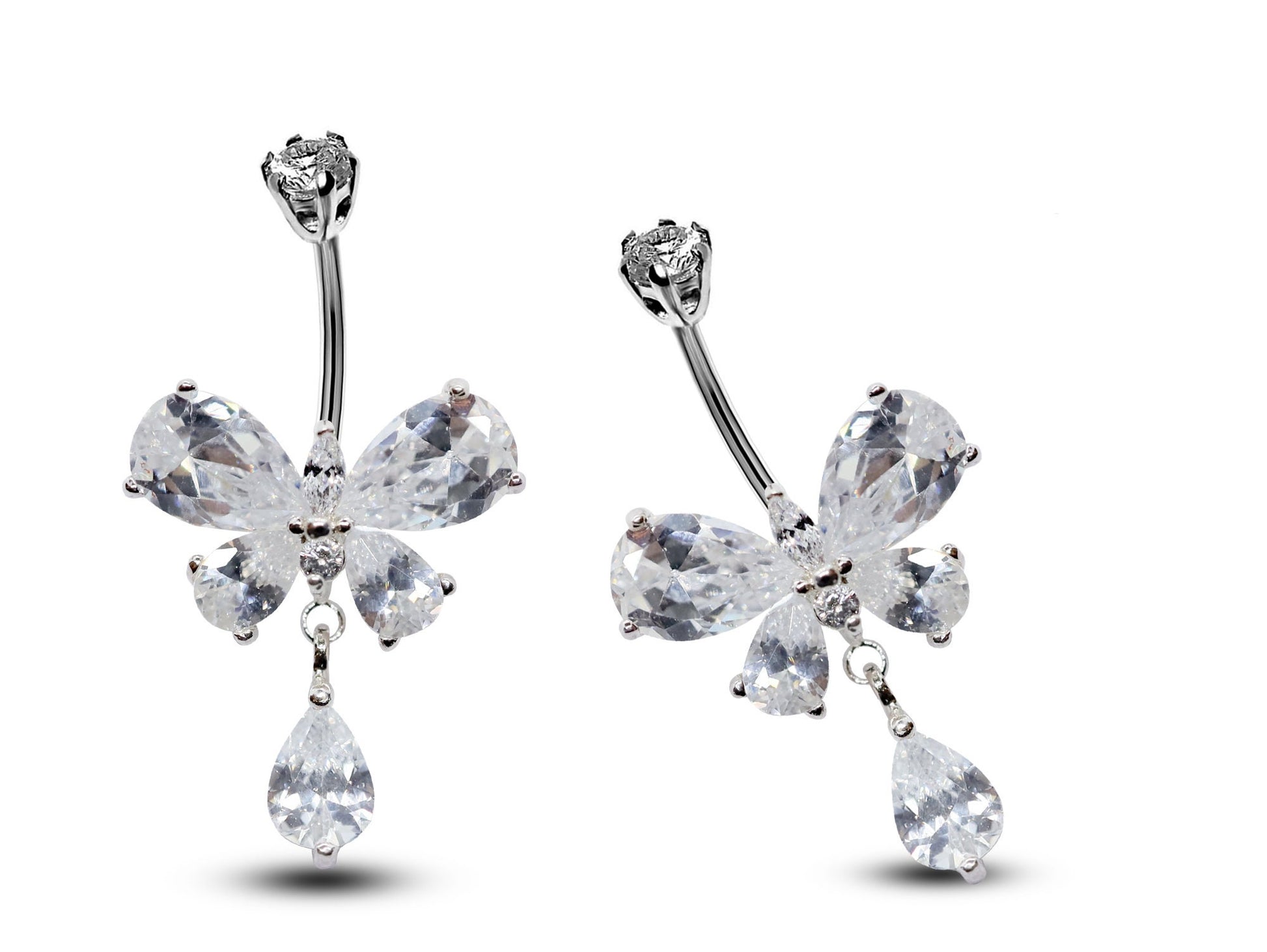 Silver Belly Button Ring, Belly Bars- Dangle Tear drop Butterfly Belly Ring with High Quality Crystals - Navel Ring - 16g (1.6mm)