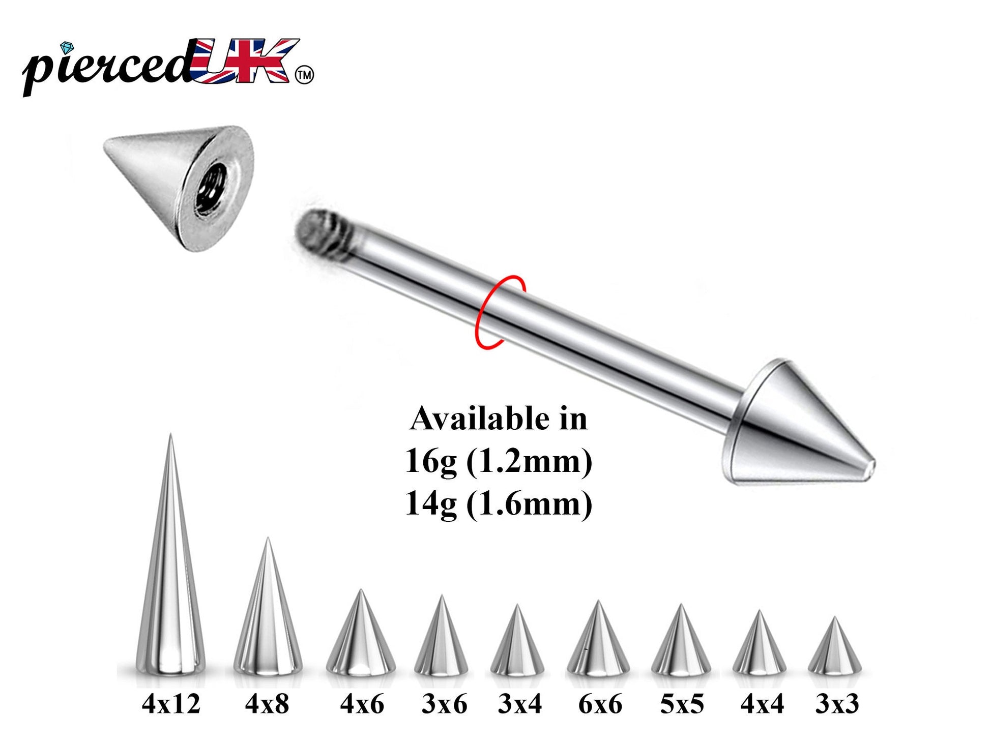 Spike Barbell, Industrial Piercing Spike – Cone Spike Straight Barbell 16g, 14g (1.2 & 1.6mm) – Nipple, Cartilage, Ear Piercing