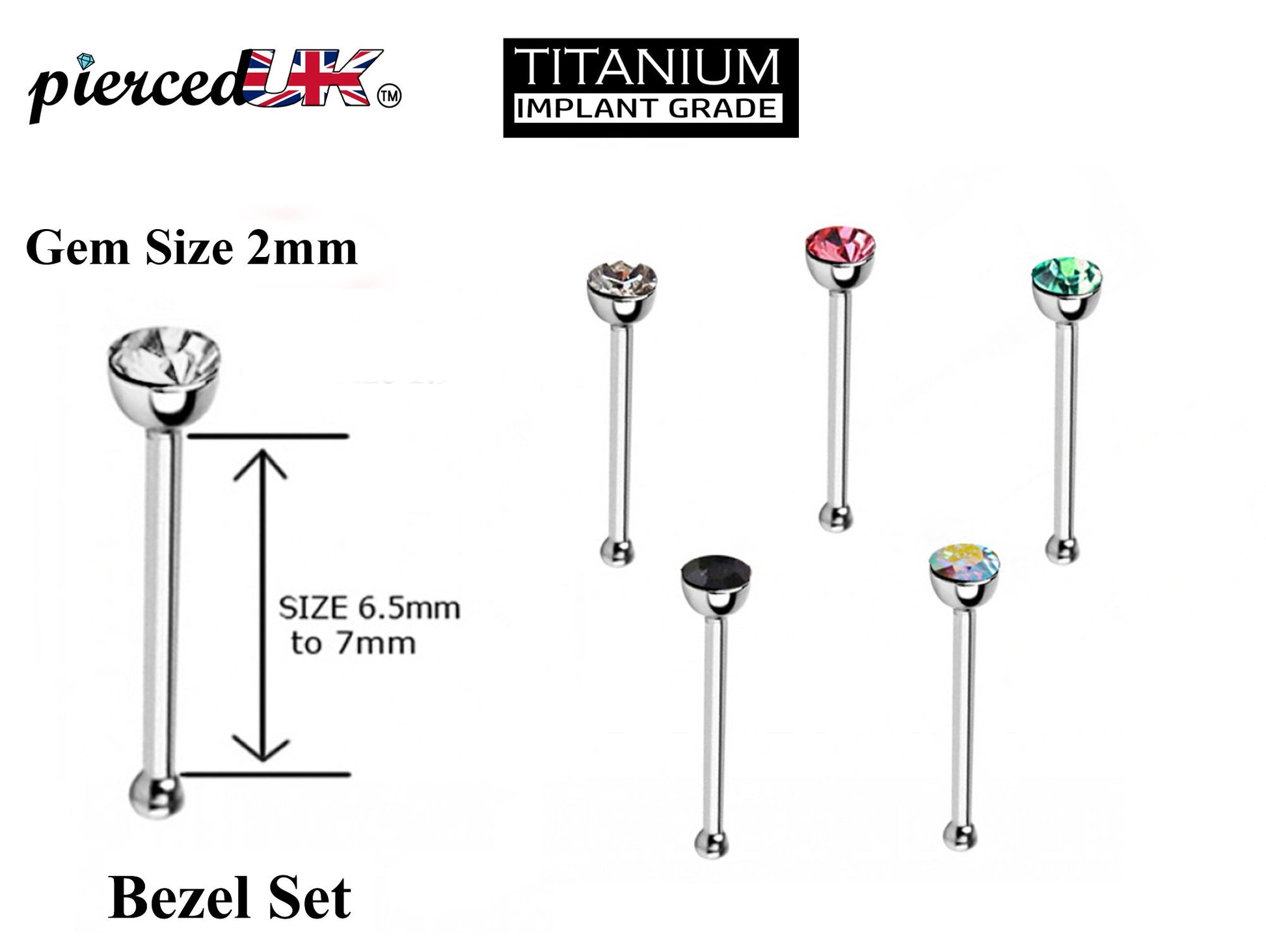 Titanium Nose Piercing, Nose Pin - Nose Bone Stud with Bezel Set CZ Crystals - Nose Ring Size 24g 20g 18g
